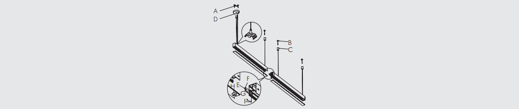 - The mounting bracket (G) is fixed on the ceiling (F) with screws (A), as shown in P1. The distance between the fixed positions refers to the fixed hole spacing at the bottom of the luminaire (B).